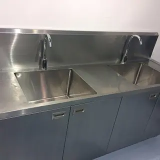 本发明涉及一种消毒洗手池,其特征在于消毒洗手池由消毒池(1),洗手池(2),出水管(3),脚踏阀(4),进水管(5),连接管(6)和漏水口(7)组成,消毒池(1)与洗手池(2)为两个并联的长方形水槽,水槽底部设有漏水口(7),消毒池(1)与洗手池(2)的隔断处设有出水管(3),出水管(3)通过连接管(6)与脚踏阀(4)相连,脚踏阀(4)还与接通自来水管道的进水管(5)相连.本发明结构设计简单,使用