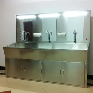 本发明涉及一种消毒洗手池,其特征在于消毒洗手池由消毒池(1),洗手池(2),出水管(3),脚踏阀(4),进水管(5),连接管(6)和漏水口(7)组成,消毒池(1)与洗手池(2)为两个并联的长方形水槽,水槽底部设有漏水口(7),消毒池(1)与洗手池(2)的隔断处设有出水管(3),出水管(3)通过连接管(6)与脚踏阀(4)相连,脚踏阀(4)还与接通自来水管道的进水管(5)相连.本发明结构设计简单,使用